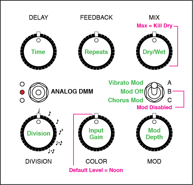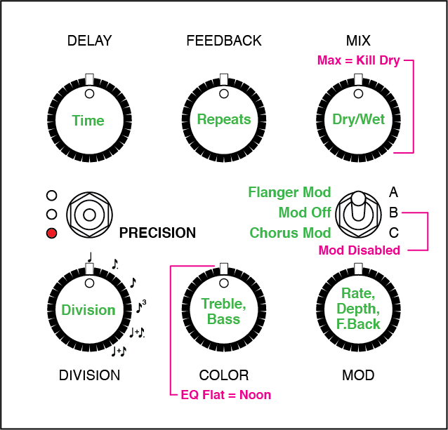 右側のミニスイッチがモジュレーション系の切り替えになったり、COLOR,MODのつまみがEQやモジュレーション系の調整機構になったりとモード切替によってそれに合わせた能力に変化するというディレイ特化のマルチペダルです。